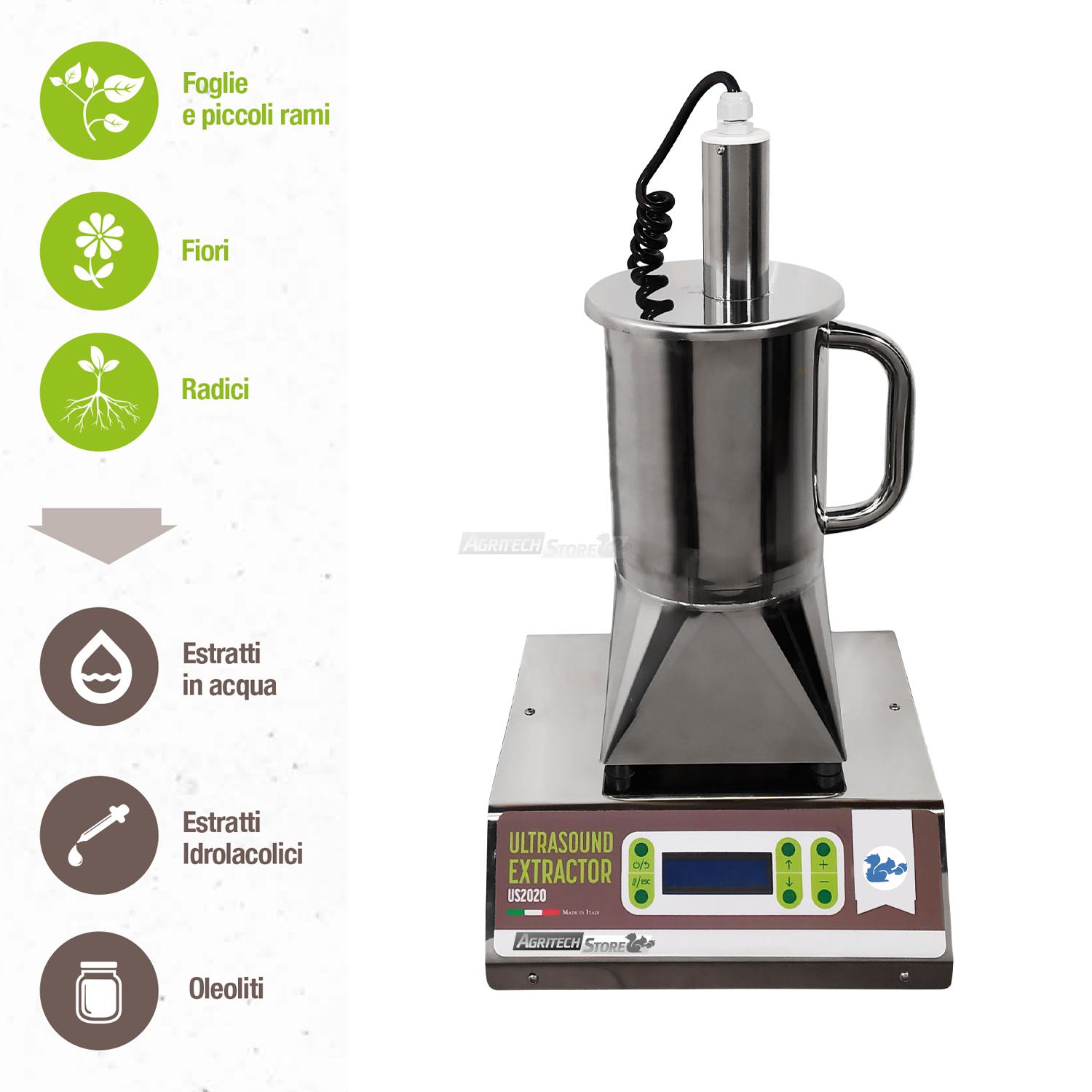 The ultrasonic extraction allows a considerable reduction in production times as the ultrasounds, breaking the cell walls, reduce the transfer times of the active ingredients. It is possible to obtain a liter of macerate in just 15 minutes.