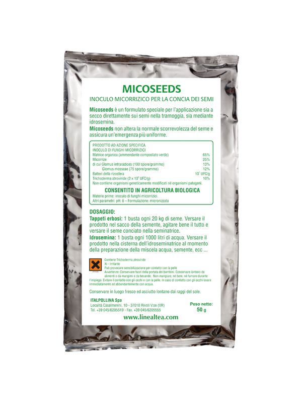 MICOSEEDS besteht aus Sporen des VAM-Pilzes Glomus intraradices, Trichoderma atroviride und Rhizosphärenbakterien, die erfolgreich im Rasenbau und auch bei der Wiederbegrünung mit Hydrosaat eingesetzt werden, wo sie neben der Erhöhung der Widerstandsfähigkeit gegen Salzgehalt auch die Vitalität des Rasens verbessern Pflanze und reduziert das Auftreten von Pilzkrankheiten.