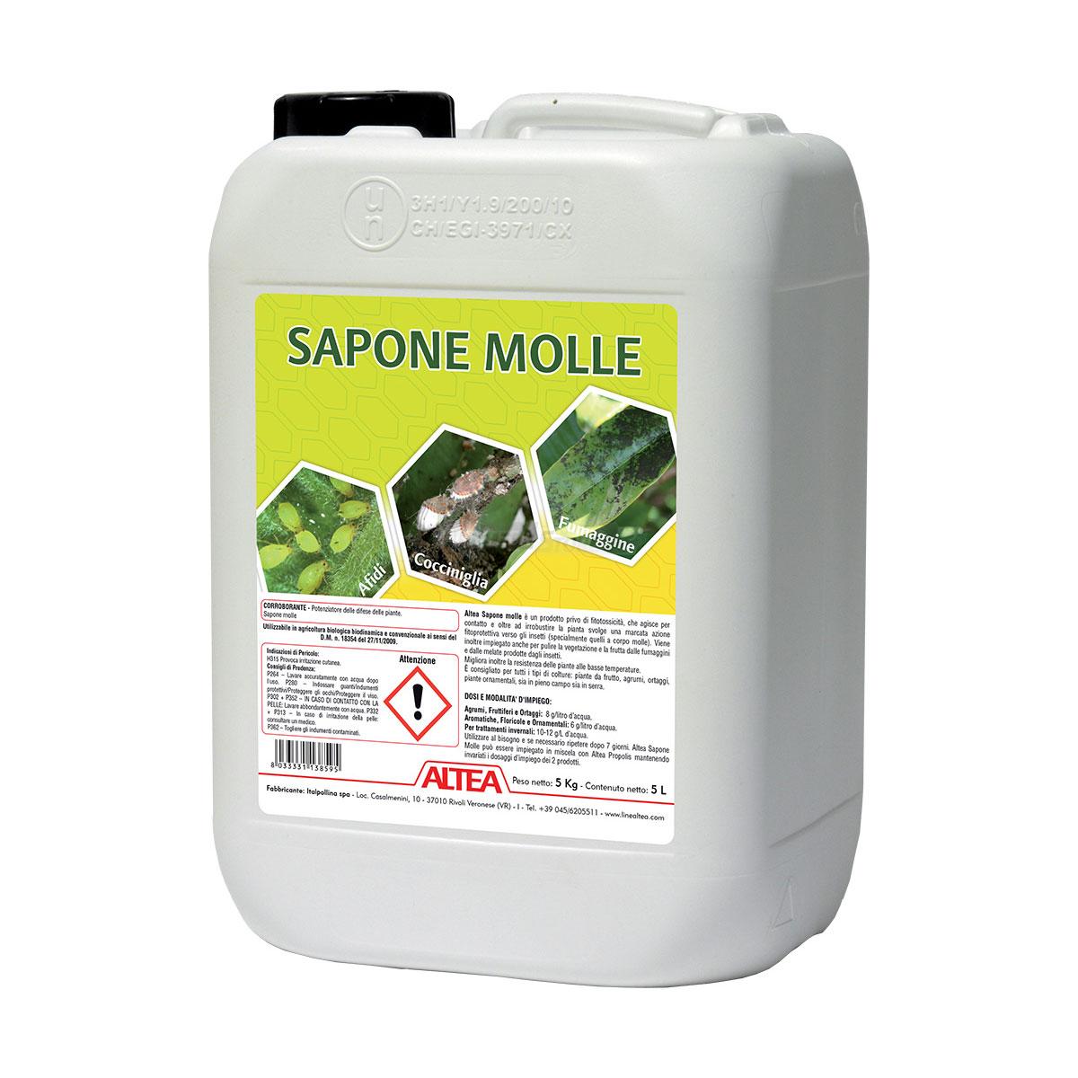 WEICHSEIFE in einem 5-Liter-Behälter ist ein Produkt mit verstärkender Wirkung, das neben einer belebenden Wirkung durch die Stärkung der Widerstandskraft der Pflanzen selbst auch eine Zersetzungswirkung auf die von Blattläusen produzierten organischen Inhaltsstoffe (Honigtau) ausübt , Psylla, Metcalfa, Cochineals , Weiße Fliegen und verhindert so die Bildung von Fumaggini und anschließendem Pilzbefall, der sich leicht auf den Zuckerresten niederlassen würde.