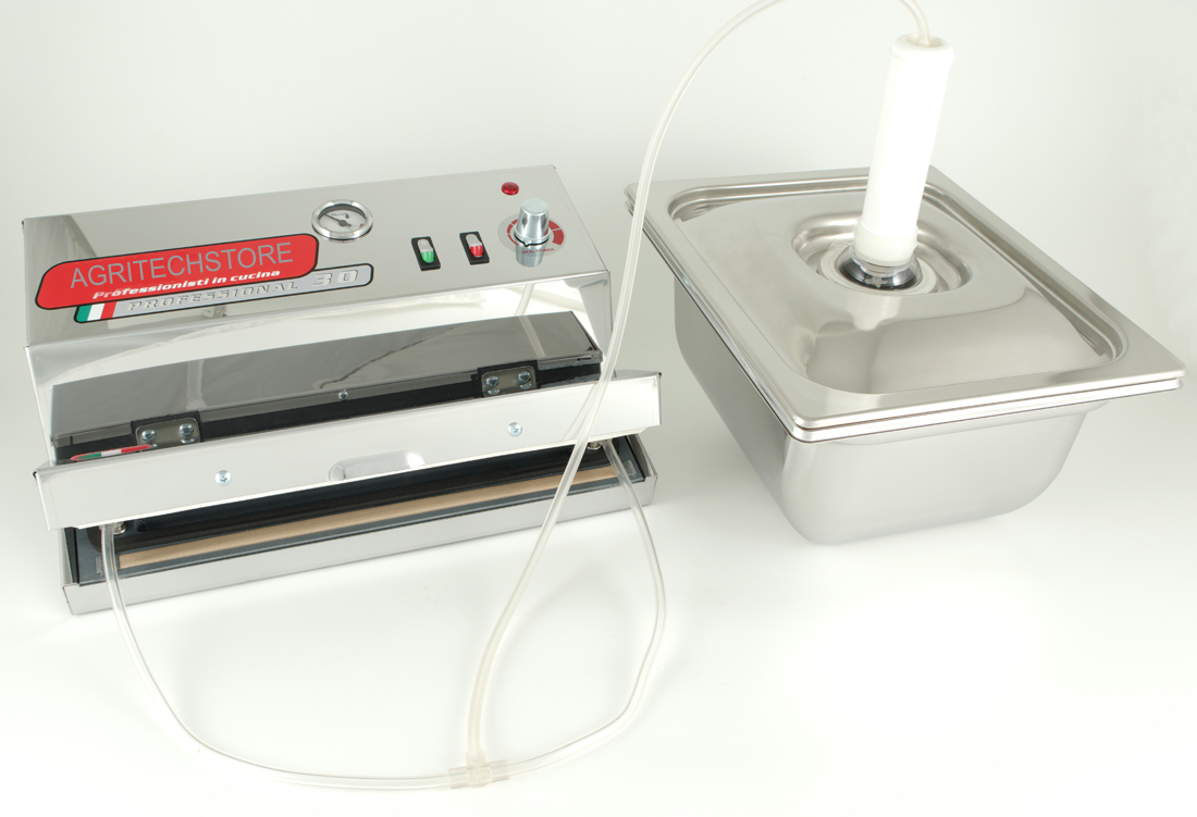 Die Pumpe für die Erzeugung des Vakuums im Vakuumbehälter Gastronormc hat eine Struktur aus gebürstetem Edelstahl, Manometer (Vakuum-Messgerät) mit einer Nadel und einer Hochleistungspumpe sehr robust.