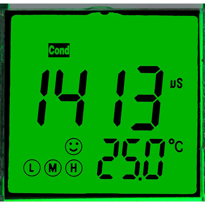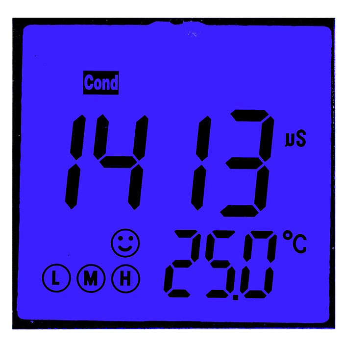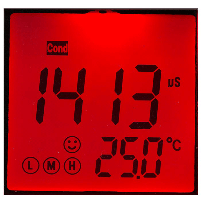 Botón de calibración de 3 puntos con 3 valores de opción estándar entre 84, 1413 y 12,88 ms ms. Lectura de la temperatura. Compensación automática de la temperatura con TR = 20/25 ° C y el factor de TC ajustable = 0,00 ... 4,00% / ° C