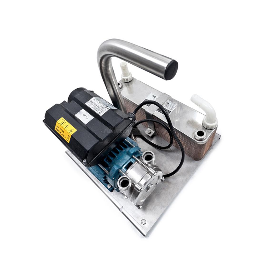 El sistema de refrigeración en cambio está formado por una bomba de transferencia en acero inoxidable "ralentizada" y un intercambiador de calor 40 placas.