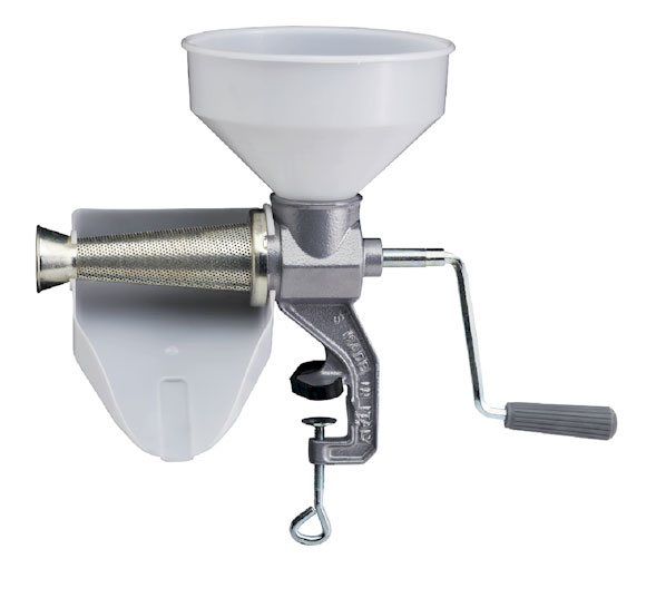 Aparato manual para la preparación de salsa de tomate, mermeladas y zumos de frutas. Apto para las exigencias de una pequeña familia.