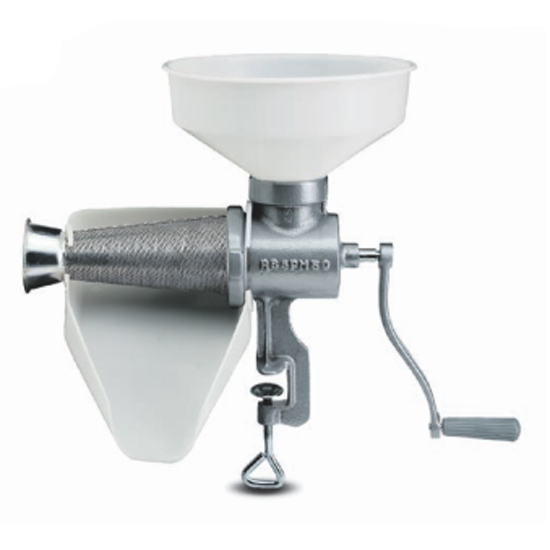 Aparato manual para la preparación de salsa de tomate, mermeladas y zumos de frutas. Apto para mayores exigencias, ya que es el más grande de los exprimidores manuales.