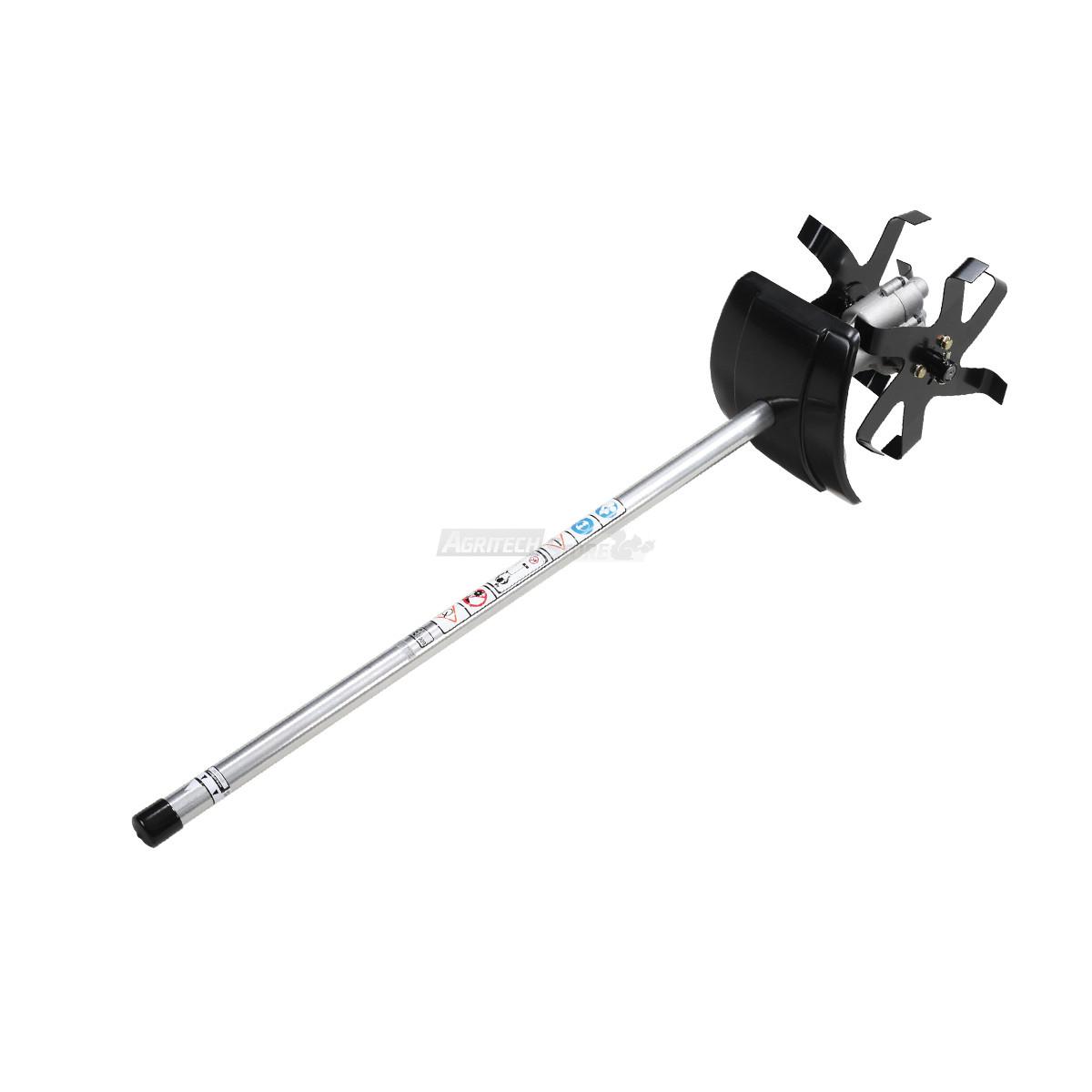 This attachment, proposed by Agritechstore, is designed for tilling small plots of land previously worked with a rotary cultivator.