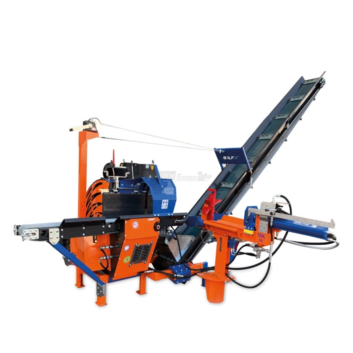 The NINJA 800 Expert is the latest addition to the BALFOR family, a truly mobile firewood splitter. Thanks to its incredible versatility, the NINJA 800 Expert can handle all types of wood, branches, and logs. By opening or closing the log support, the operator can decide whether the wood falls directly onto the belt or is picked up and then split. The log splitter has 16 tons of power and a sturdy hydraulic splitting wedge with two interchangeable splitting wedges. The wide conveyor belt with three hydraulic sections allows for quick and efficient removal of all the wood being processed by the machine. The logs are fed via a conveyor belt, and the 800mm WIDIA blade is moved entirely hydraulically. The operator simply operates the levers, as with all firewood splitters. Being entirely hydraulic, maintenance is kept to a minimum, and to prevent overheating, a larger tank combined with a large oil radiator was chosen. The NINJA 800 Expert is already equipped with catenary connections to maximize automation.