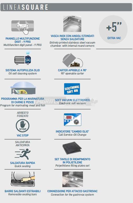 Profesjonalne urządzenie całkowicie zbudowane ze stali nierdzewnej o bardzo szerokim zastosowaniu. Wyposażone w innowacyjne funkcje technologiczne, niezbędne do pakowania różnych produktów (sosy, płyny, mięso, ryby i warzywa), znajduje zastosowanie w najróżniejszych sektorach, od gastronomii, catering, po supermarket itd. Urządzenie wyposażone w system wtrysku gazu obojętnego (na życzenie), jest w stanie pakować i chronić szczególnie delikatne produkty żywnościowe.
