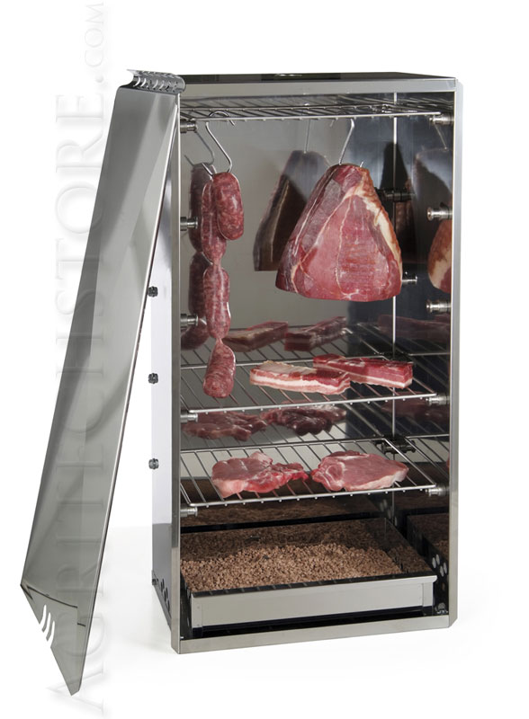 Afumătoare din oțel inoxidabil 10040N 46x29x86 Cameră mare de afumare: pentru carne, pește, brânză, mezeluri și alimente în general. Vă permite să aromatizați alimentele și să le prelungiți durata de valabilitate. Structură din oțel inoxidabil AISI 430 Include 3 grătare din oțel inoxidabil AISI 304 și 5 cârlige cu un singur punct din oțel inoxidabil pentru agățarea produselor care urmează să fie afumate Sertar arzător și tavă de degresare din oțel inoxidabil AISI 430 Furnizat cu un pachet de 1 kg de material pentru fumat (așchii de lemn de esență tare comprimate) pentru 5/10 cicluri Capac frontal glisant și complet deschis, pentru a permite introducerea orizontală a grilelor Regulator de tiraj superior Orificiu de introducere a termometrului pentru verificarea temperaturii Materialul de fumat REBER este obținut din lemn de fag și stejar comprimat, fără utilizarea de cleiuri sau alte substanțe chimice. Tratamentul de compresie permite o producție dublă de căldură și fum în comparație cu materialul necomprimat disponibil pe piață.