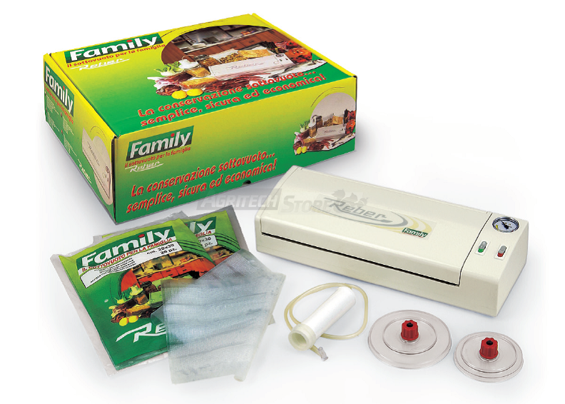 Mașină de etanșat în vid Reber Family 9700 NF Ambalarea în vid implică eliminarea aerului din pungi sau recipiente pentru a prelungi și îmbunătăți durata de valabilitate a conținutului. Datorită mașinilor de ambalat în vid REBER, oferite de Agritechstore, timpii de depozitare sunt prelungiți de până la 5 ori față de depozitarea tradițională. Ambalarea în vid nu este o alternativă la congelare și alte sisteme de conservare, dar poate fi utilizată în combinație cu acestea. pentru a păstra mai bine aromele, gusturile și proprietățile nutritive ale alimentelor. Mașinile de ambalat în vid REBER aduc cea mai bună calitate în fiecare bucătărie. Mașini profesionale de ambalat în vid: mai puține deșeuri, igienă sporită, produse mai bine conservate. Mașina de etanșat în vid FAMILY este echipată cu o pompă de vid profesională de mare capacitate, și o tastatură LED luminoasă pentru o ușurință extremă în utilizare.