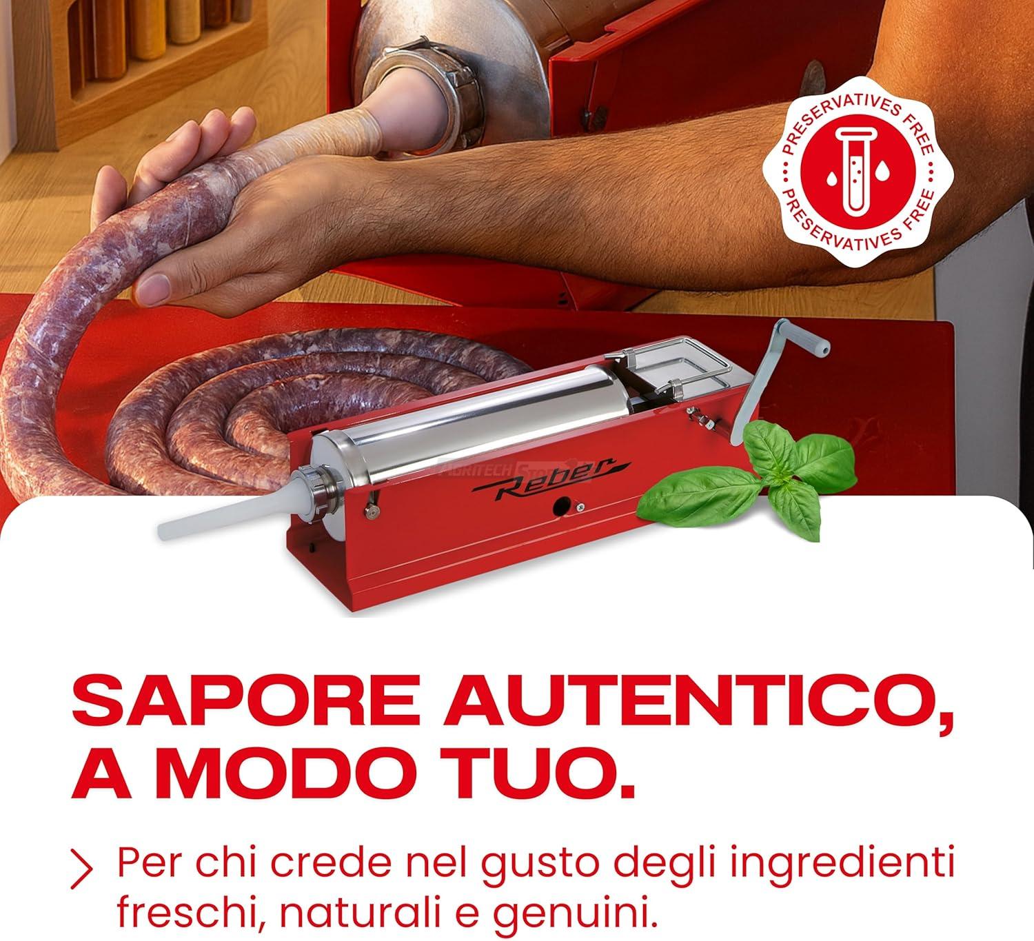 AROMĂ AUTENTICĂ, STILUL TĂU: Proiectată și fabricată în Italia, leagănul marii tradiții gastronomice a Italiei, mașina manuală de umplut cârnați Reber îți permite să creezi cârnați personalizați, gata pentru grătar și creați după propriile rețete. Tu alegi carnea, condimentele și carnea tocată: controlezi fiecare ingredient, eviți conservanții industriali și aduci pe masă arome autentice și autentice.