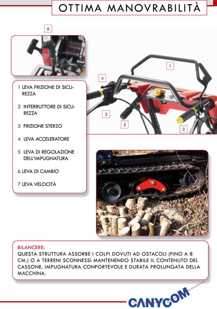 Cambio a 6 velocità avanti e due retro, motore a bassissime emissioni sia gassose che sonore, comandi morbidissimi anche dopo anni di intenso uso, rulli centrali basculanti per ammortizzare meglio gibbosità e affossamenti del terreno e rendere la guida più sicura e comoda.
