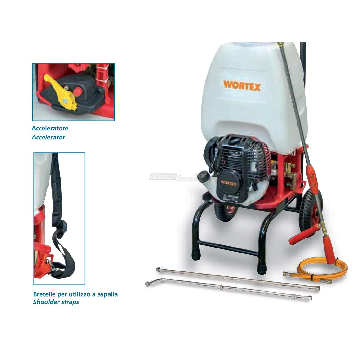 Wortex 4-Stroke trolley, with piston pump and a prolipopylene tank with a capacity of 25 liters.